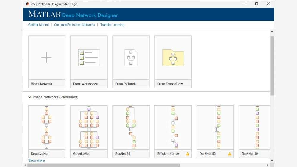 Deep Network Designer uygulaması ile derin öğrenme ağları etkileşimli ve düşük kodlu bir yaklaşımla tasarlanabilir. PyTorch ve TensorFlow’dan aktarılan modeller veya hazır mimariler (SqueezeNet, GoogLeNet, ResNet-50 gibi) kolayca kullanılabilir.