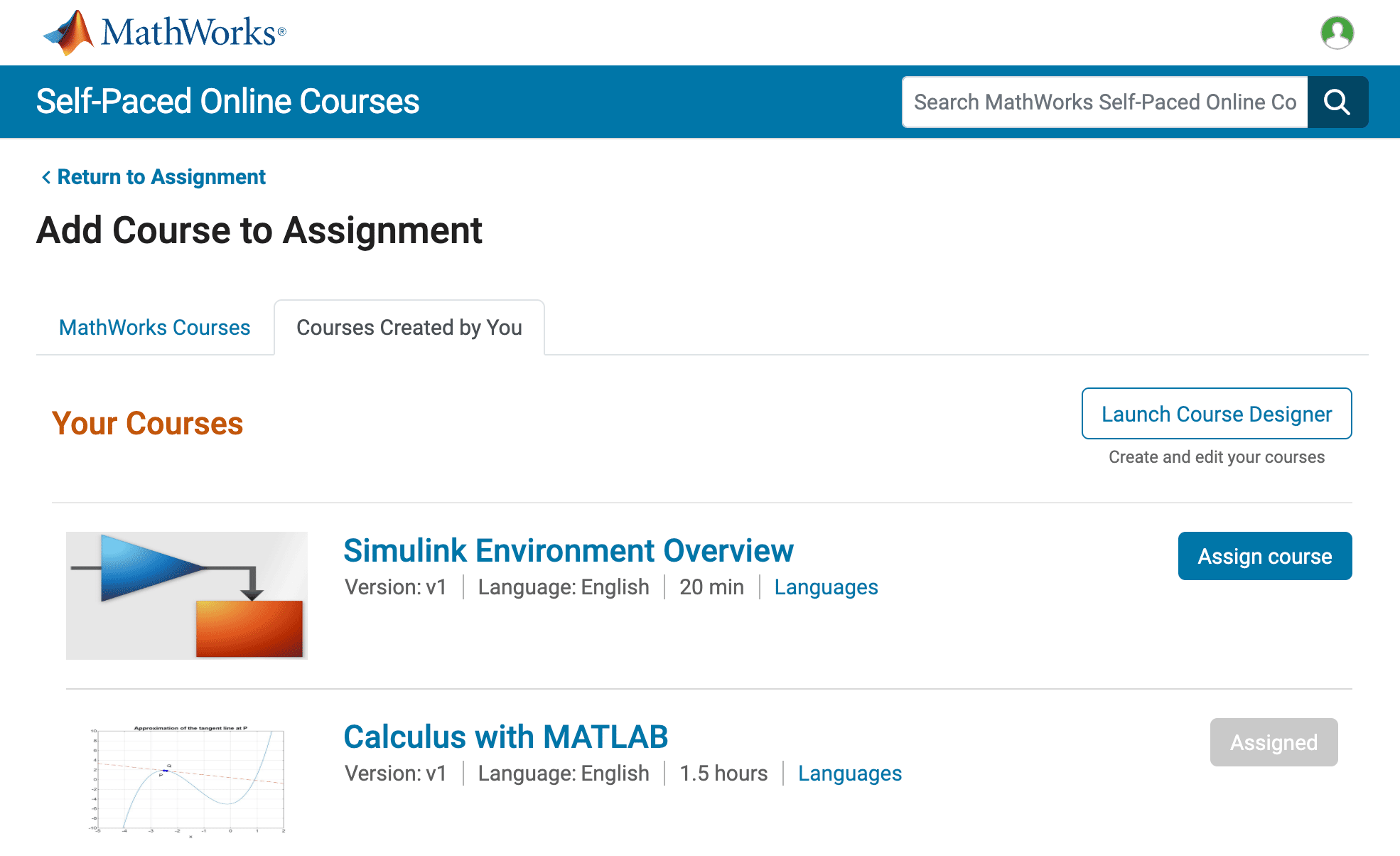 Oluşturduğunuz kursları, öğrenme yönetim sisteminiz (LMS) üzerinden öğrencilere atayabilirsiniz. Ayrıca MathWorks tarafından sunulan self-paced (kendi hızında öğrenme) kursları da atama imkânına sahipsiniz.