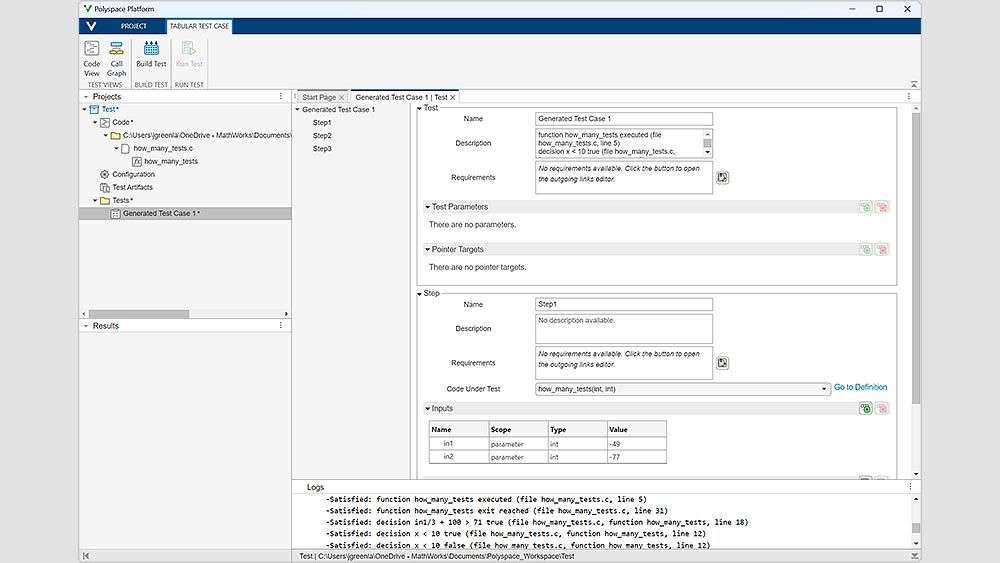 Polyspace Test; Polyspace Bug Finder, Polyspace Code Prover ve dinamik test yeteneklerini ortak bir kullanıcı arayüzü üzerinden yapılandırma, çalıştırma ve sonuçları görüntüleme imkânı sunar.