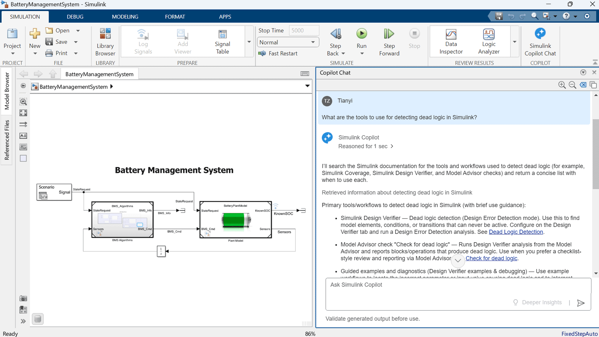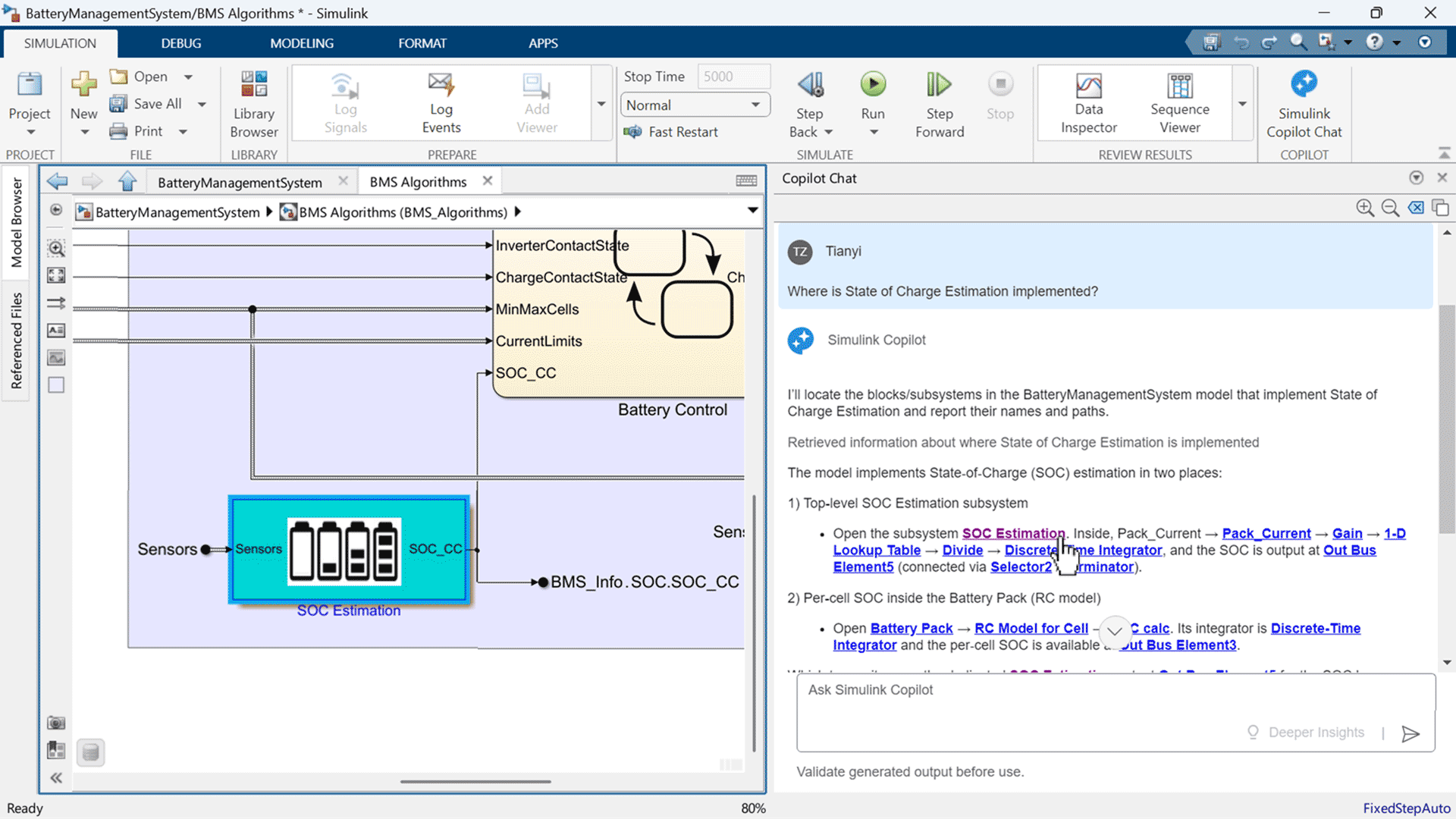 Simulink Copilot’a araç önerileri, modelleme teknikleri ve tasarım en iyi uygulamaları hakkında sorular sorabilirsiniz. Yanıtlar, açık olan Simulink modeliniz ve MathWorks dokümantasyonu ile kaynaklarına dayanarak üretilir.