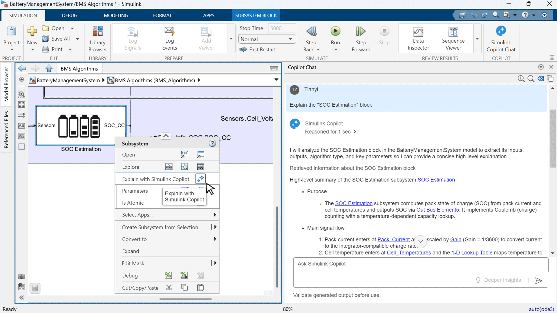 Simulink Copilot ile karmaşık veya aşina olmadığınız modelleri ve blokları anlaşılır şekilde yorumlayabilirsiniz. Model yapısını ve bloklar arasındaki ilişkileri hızlıca analiz ederek sistemi daha iyi kavrayabilirsiniz.