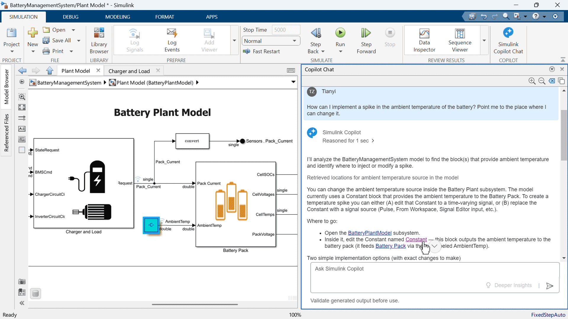 Yeni bir tasarım oluşturma veya mevcut bir tasarım üzerinde değişiklik yapma süreçlerinde Simulink Copilot’tan yönlendirme alabilirsiniz. Alternatif tasarım yaklaşımları ve teknik öneriler sunar.