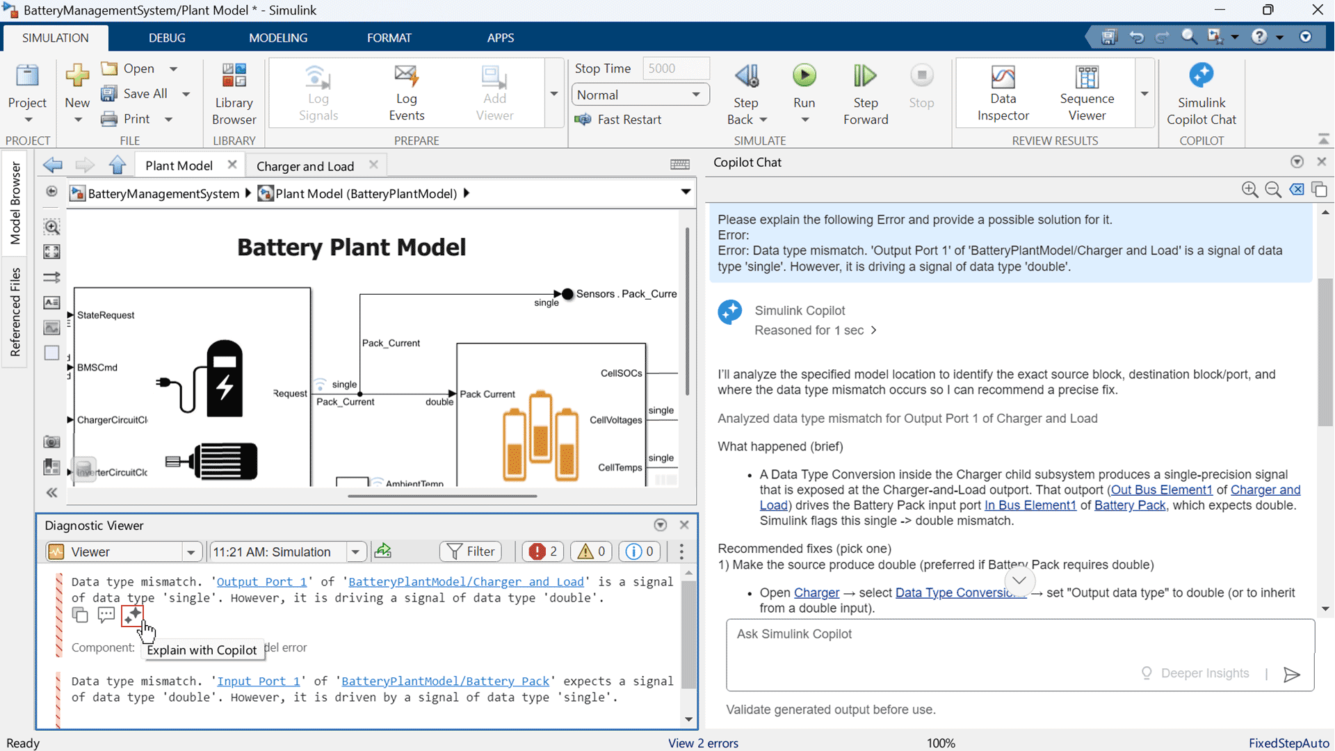 Karşılaşılan hata mesajları için açıklama ve çözüm önerileri alın. Simulink Copilot, hatanın olası kök nedenlerini analiz eder ve çözüm adımlarını önerir.