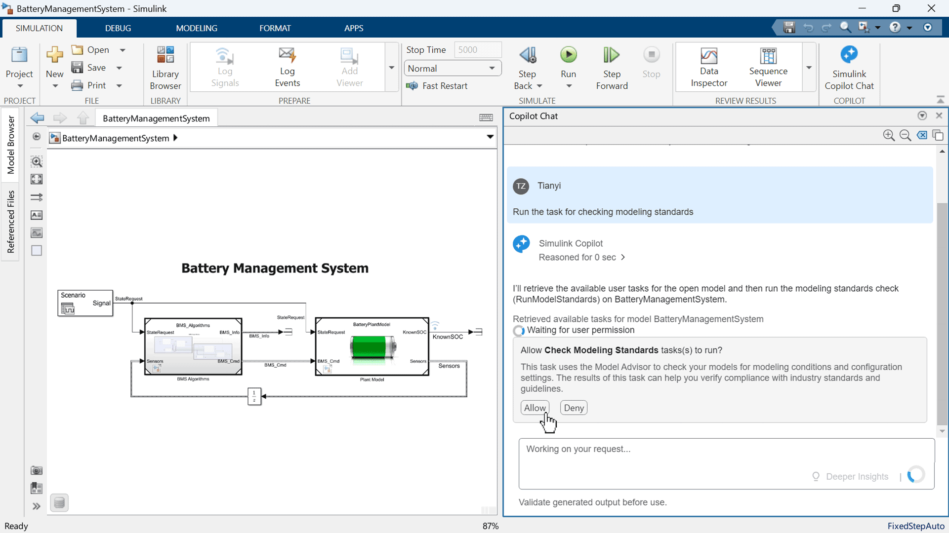 Process Advisor içinde tanımlı görevleri Simulink Copilot’a devrederek manuel işlem yükünü azaltabilirsiniz. Simulink Check için CI/CD Automation süreçleriyle birlikte görevlerin çalıştırılması ve takibi otomatik hale getirilebilir.